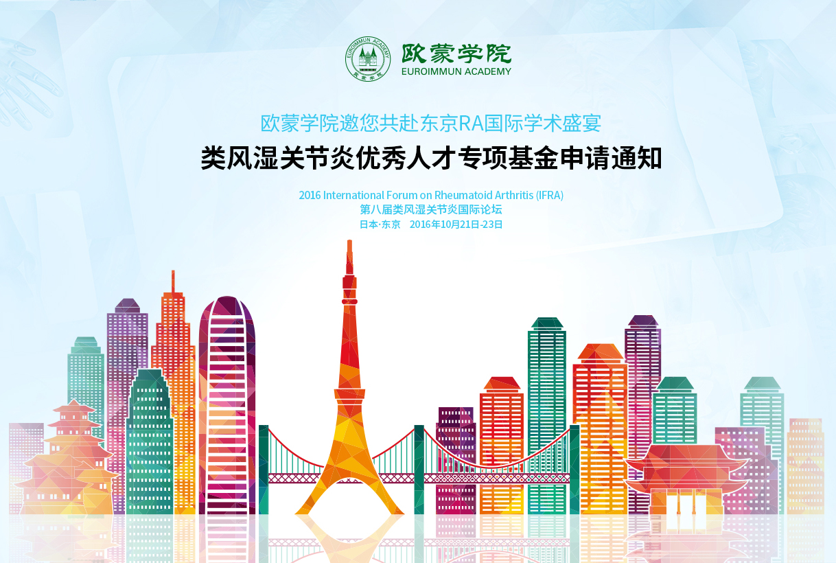 第八屆“類風濕關節炎國際論壇(IFRA)”將于2016年10月21~23日在日本東京召開,該論壇為風濕領域的國際性學術盛會。歐蒙學院秉承“分享前沿知識,推動醫學教育”的宗旨,以提高疾病的行業診斷水平為愿景,為推動類風濕關節炎(RA)疾病的醫療學術發展,特設立“歐蒙學院——類風濕關節炎優秀人才”專項基金,由歐蒙學院資助RA領域的優秀人才赴東京參會。