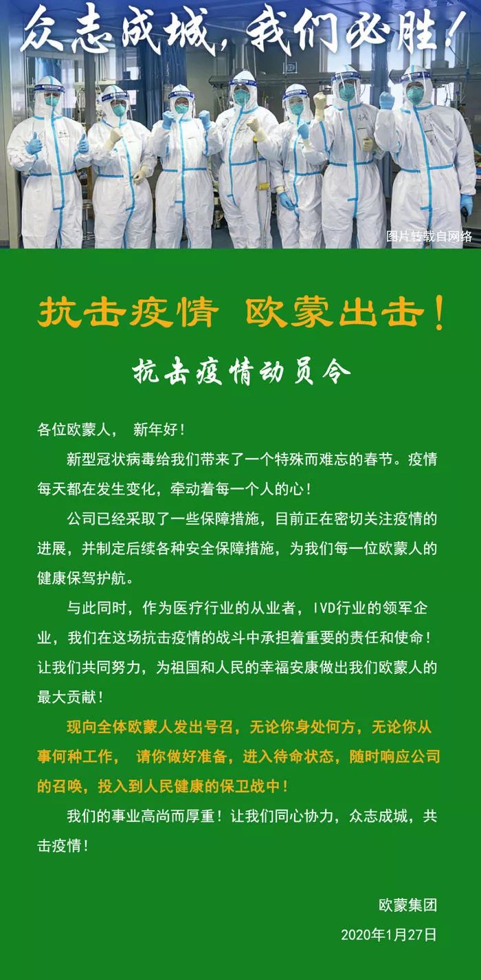 2020年的春節(jié),因?yàn)橐粓鲂滦凸跔畈《痉窝椎膫鞑ィ尯芏嗳说拇汗?jié)假期因此改變。自疫情發(fā)生以來,歐蒙一直都保持著高度的關(guān)注,面對(duì)疫情快速響應(yīng),在第一時(shí)間成立了三個(gè)工作組,部署相        關(guān)戰(zhàn)略實(shí)施:應(yīng)急領(lǐng)導(dǎo)小組、銷服協(xié)調(diào)小組、緊急行動(dòng)小組。應(yīng)急領(lǐng)導(dǎo)工作小組第一時(shí)間將公司最新動(dòng)態(tài)與決策以最快速度傳遞到每一位歐蒙員工中,并采取各種措施保障員工的安全;銷服協(xié)調(diào)小組緊急召回部分員工,保證我們對(duì)醫(yī)療機(jī)構(gòu)的支持與服務(wù);緊急行動(dòng)小組通過對(duì)新冠病毒檢測服務(wù)與產(chǎn)品的開發(fā),力爭為抗擊疫情做出更多貢獻(xiàn)。大家眾志成城、共克時(shí)艱!