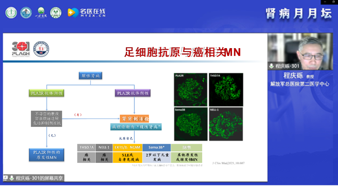 程慶礫教授與大家分享了膜性腎病與腫瘤的相關(guān)內(nèi)容,程教授指出:膜性腎病尤其是老年人的膜性腎病一定要警惕合并有癌癥。膜性腎病與癌癥之間的時(shí)間關(guān)系比較復(fù)雜,患者可先患癌,后發(fā)生膜性腎病;或兩者同時(shí)被發(fā)現(xiàn);大約有20%的患者先診斷出膜性腎病,后發(fā)現(xiàn)患癌,事實(shí)上,癌癥仍然是早于膜性腎病之前發(fā)生的,只是現(xiàn)有手段未能檢出癌的存在。合并癌癥的膜性腎病預(yù)后不良。癌癥相關(guān)的膜性腎病PLA2R抗體或抗原檢查多為陰性,腎小球上IgG沉積以IgG1~IgG2亞型表達(dá)占優(yōu)勢(shì),IgG4亞型常為陰性,但也有例外。程教授重點(diǎn)闡述了癌相關(guān)膜性腎病的發(fā)生機(jī)制,包括腫瘤可以產(chǎn)生與內(nèi)源性足細(xì)胞抗原相同或具有類似表原的腫瘤抗原的抗體,從而導(dǎo)致原位免疫復(fù)合物形成;腫瘤釋放出可溶性抗原,激活機(jī)體產(chǎn)生相應(yīng)抗體,形成循環(huán)免疫復(fù)合物,沉積在腎小球毛細(xì)血管上皮下;分子大小和電荷合適的腫瘤抗原隨血液循環(huán)到達(dá)腎小球毛細(xì)血管,種植在腎小球基底膜上,刺激機(jī)體產(chǎn)生抗體,形成原位免疫復(fù)合物,造成腎小球?yàn)V過屏障損傷,等等。程教授也指出,最近幾年足細(xì)胞抗原的研究非常熱門,包括PLA2R、THSD7A、NELL-1等均有可能與腫瘤相關(guān)。懷疑癌相關(guān)膜性腎病應(yīng)認(rèn)真進(jìn)行腫瘤的篩查,尤其是針對(duì)結(jié)直腸癌、肺癌、膀胱癌、腎癌、前列腺癌、乳腺癌等的篩查。癌相關(guān)的膜性腎病治療應(yīng)以原發(fā)病治療為主,但一般支持治療也很重要。免疫抑制劑的治療宜慎重,尤其是采用環(huán)磷酰胺等藥物治療需謹(jǐn)慎,必要時(shí)可以采用B細(xì)胞靶向單抗治療。