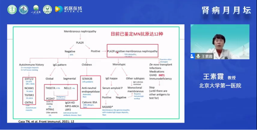 王素霞教授在線分享了非典型膜性腎病診斷和鑒別診斷的思路。首先介紹了膜性腎病的基本病理特征,以及近十年來膜性腎病致病性抗原的研究有了飛速的進(jìn)展,尤其在2009年Beck團(tuán)隊(duì)發(fā)現(xiàn)了原發(fā)性MN的抗原PLA2R及血清抗體IgG4。使得對MN的認(rèn)識有了飛躍的進(jìn)展。王教授指出對于非典型膜性腎病的診斷,首先應(yīng)當(dāng)根據(jù)其病理表現(xiàn)進(jìn)行初步的判斷。繼發(fā)性MN常表現(xiàn)為不典型MN,光鏡檢查、免疫熒光、IgG亞型-輕鏈、抗原檢測和電鏡檢查等有助于典型與非典型MN的鑒別診斷。多種病因可導(dǎo)致繼發(fā)性膜性腎病,青年人應(yīng)排除外感染、自身免疫病、藥物、毒物(汞)等相關(guān)MN;老年人注意排除外腫瘤相關(guān)MN。腫瘤相關(guān)MN的抗原種類包括NELL-1,IgG亞型以IgG1為主,第二位與腫瘤相關(guān)的MN抗原為THSD7A,也有相關(guān)文獻(xiàn)表明極少數(shù)腫瘤相關(guān)MN也可表達(dá)PLA2R。王教授還指出不同致病性抗原的檢測有助于繼發(fā)性MN的病因?qū)W診斷,MN為一類病理形態(tài)相似的損傷模式,推薦基于抗原與繼發(fā)性疾病相結(jié)合的MN新分類,將為臨床治療與發(fā)病機(jī)制探討提供重要依據(jù)。