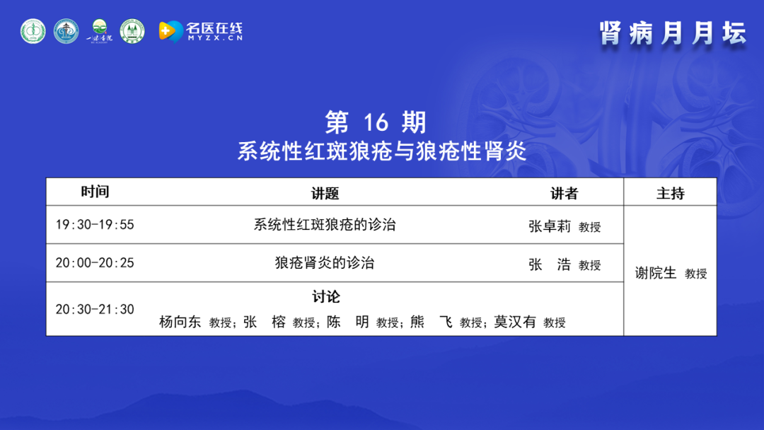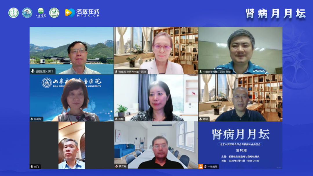 2023年8月15日,由北京中西醫(yī)結(jié)合學(xué)會(huì)腎臟病專(zhuān)業(yè)委員會(huì)舉辦的《腎病月月壇(第16期)——系統(tǒng)性紅斑狼瘡與狼瘡性腎炎》于線(xiàn)上成功舉行。本次論壇由北京中西醫(yī)結(jié)合學(xué)會(huì)腎臟病專(zhuān)業(yè)委員會(huì)主任委員、解放軍總醫(yī)院第一醫(yī)學(xué)中心謝院生教授擔(dān)任大會(huì)主席,北京大學(xué)第一醫(yī)院張卓莉教授、中南大學(xué)湘雅三醫(yī)院張浩教授作為講課嘉賓,山東大學(xué)齊魯醫(yī)院楊向東教授、中國(guó)醫(yī)科大學(xué)附屬第一醫(yī)院張榕教授、成都中醫(yī)藥大學(xué)附屬醫(yī)院陳明教授、武漢市第一醫(yī)院熊飛教授以及廣西醫(yī)科大學(xué)第一附屬醫(yī)院莫漢有教授作為本次大會(huì)的討論嘉賓。
