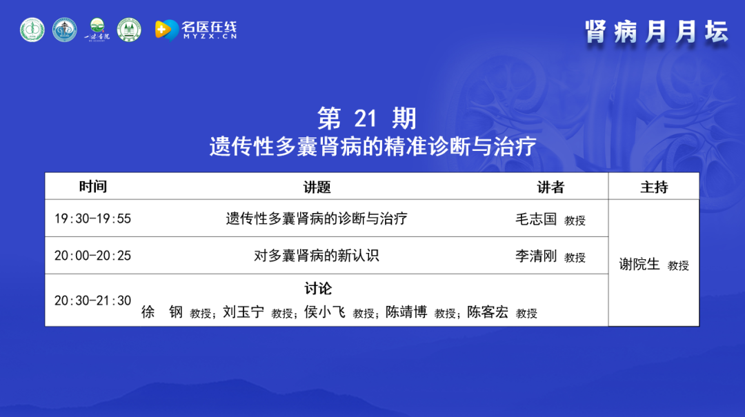2024年1月16日,由北京中西醫(yī)結(jié)合學(xué)會(huì)腎臟病專業(yè)委員會(huì)舉辦的《腎病月月壇(第21期)——遺傳性多囊腎病的精準(zhǔn)診斷與治療》于線上成功舉行。本次論壇由北京中西醫(yī)結(jié)合學(xué)會(huì)腎臟病專業(yè)委員會(huì)主任委員、北京中西醫(yī)結(jié)合腎臟疑難病會(huì)診中心主任、解放軍總醫(yī)院謝院生教授擔(dān)任大會(huì)主席,海軍軍醫(yī)大學(xué)上海長(zhǎng)征醫(yī)院毛志國(guó)教授、解放軍總醫(yī)院第一醫(yī)學(xué)中心李清剛教授作為講課嘉賓,華中科技大學(xué)同濟(jì)醫(yī)學(xué)院附屬同濟(jì)醫(yī)院徐鋼教授、北京中醫(yī)藥大學(xué)東直門(mén)醫(yī)院劉玉寧教授、北京大學(xué)第三醫(yī)院侯小飛教授、臺(tái)灣高雄長(zhǎng)庚紀(jì)念醫(yī)院陳靖博教授以及陸軍軍醫(yī)大學(xué)陸軍特色醫(yī)學(xué)中心陳客宏教授作為本次大會(huì)的討論嘉賓。