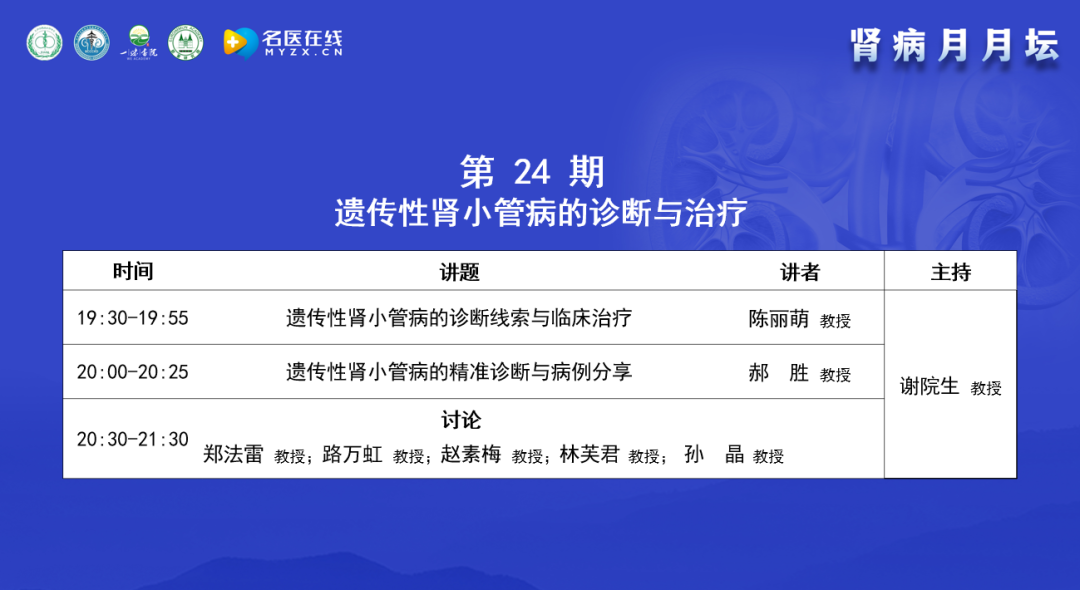 謝教授簡(jiǎn)單介紹了“腎病月月壇”的歷史,“腎病月月壇”是在2022年5月開(kāi)始舉辦的線(xiàn)上學(xué)術(shù)交流活動(dòng),迄今為止正好兩年時(shí)間,24個(gè)月共舉辦了24期,每月一期,每一期都是在每月第3周的周二晚上19:30-21:30開(kāi)展,形式是講座與討論相結(jié)合。“腎病月月壇”最開(kāi)始議題聚焦在膜性腎病,后來(lái)逐漸延展至多器官損害、新冠相關(guān)的多系統(tǒng)損害及風(fēng)濕性疾病的腎臟損害等,今年以遺傳性腎病為主,今天的主題是遺傳性腎小管病的診斷與治療,邀請(qǐng)了在該領(lǐng)域臨床及研究方面有很深造詣的專(zhuān)家進(jìn)行交流。