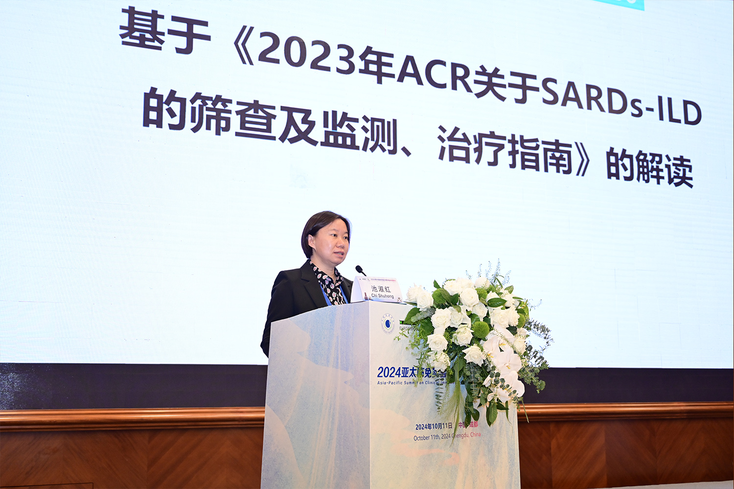 池淑紅教授做了題為“基于《2023年ACR關于SARDs-ILD的篩查及監測、治療指南》的解讀”的精彩報告。池教授結合臨床實踐,詳細解讀了美國風濕病學會最新發表的關于風濕性疾病相關間質性肺病篩查、監測和治療的指南。報告伊始,池教授首先指出CTD相關間質性肺病近些年受到多學科專家的關注,包括風濕免疫科的專家,在診斷和治療等方面都取得了很大的進步,但臨床中仍面臨很多的挑戰,如很多醫生對CTD-ILD篩查、如何合理監測、治療方案如何合理選擇等方面認識上存在一些問題。本次的指南非常詳盡的就篩查、監測和治療進行了推薦。隨后,池教授分別就篩查監測和治療兩篇指南進行了解讀。在篩查和監測部分,池教授詳細介紹了指南中對于SARD-ILD篩查和監測的方法和頻率的推薦意見,其中特別指出,在監測時對于部分風濕科的醫生,相比肺功能檢查會更重視HRCT的檢查,需注意肺功能穩定且患者沒有癥狀的時候不需要對患者頻繁地進行HRCT監測,風濕科醫生需要重視肺功能的檢查。在治療部分,池教授詳細介紹了指南中SARD-ILD的一線治療方案、經治療后仍發生ILD進展的二線治療方案和SARD合并RP-ILD的治療方案,此外,也簡單介紹了指南中關于藥物毒性和監測指導的建議以及SARD-ILD患者護理中可考慮的其他綜合藥物干預措施。