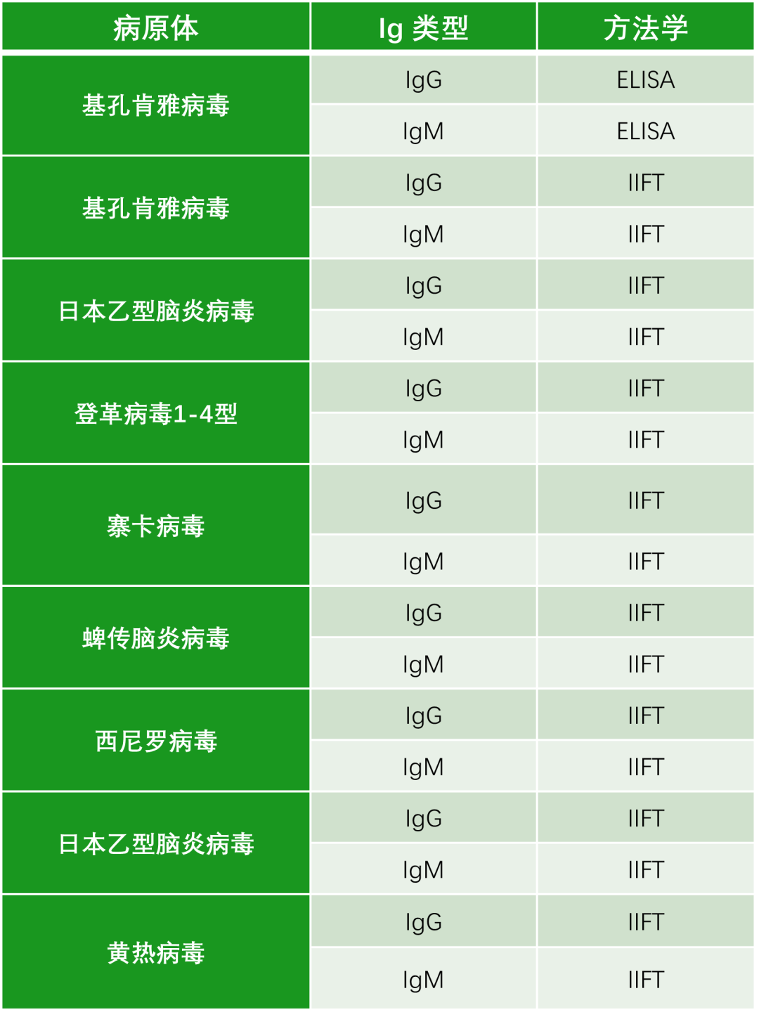 • IgG陽(yáng)性結(jié)果,表明曾受到基孔肯雅病毒感染;恢復(fù)期血清抗體滴度比急性期抗體滴度有4倍或4倍以上升高則可確診。