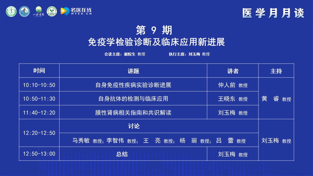 謝教授簡(jiǎn)單介紹了“醫(yī)學(xué)月月談”的前身“腎病月月壇”的歷史,“腎病月月壇”是在疫情防控期間開(kāi)展的線上學(xué)術(shù)交流活動(dòng),以腎臟病或系統(tǒng)性疾病腎損害的診治為主,每期一個(gè)主題,形式和內(nèi)容都很受歡迎。為了讓更多的人受益,升級(jí)為“醫(yī)學(xué)月月談”。“醫(yī)學(xué)月月談”秉承“腎病月月壇”的優(yōu)良傳統(tǒng),聚焦醫(yī)學(xué)工作的熱點(diǎn)和難點(diǎn),以臨床需求為導(dǎo)向,以解決臨床問(wèn)題為目的,每月主辦1-2次線下和線上相結(jié)合的醫(yī)學(xué)交流活動(dòng),線下在全國(guó)的城市輪流舉辦,已相繼在北京、沈陽(yáng)、上海、南京、武漢、福州等地成功舉辦8期醫(yī)學(xué)月月談。本期醫(yī)學(xué)月月談的主題是免疫學(xué)檢驗(yàn)診斷及臨床應(yīng)用新進(jìn)展,非常榮幸的邀請(qǐng)到新疆維吾爾自治區(qū)中醫(yī)醫(yī)院檢驗(yàn)科主任劉玉梅教授作為本期的執(zhí)行主席,相信本期月月談將在劉教授的引導(dǎo)下,在各位專家們的大力支持下,取得圓滿成功。