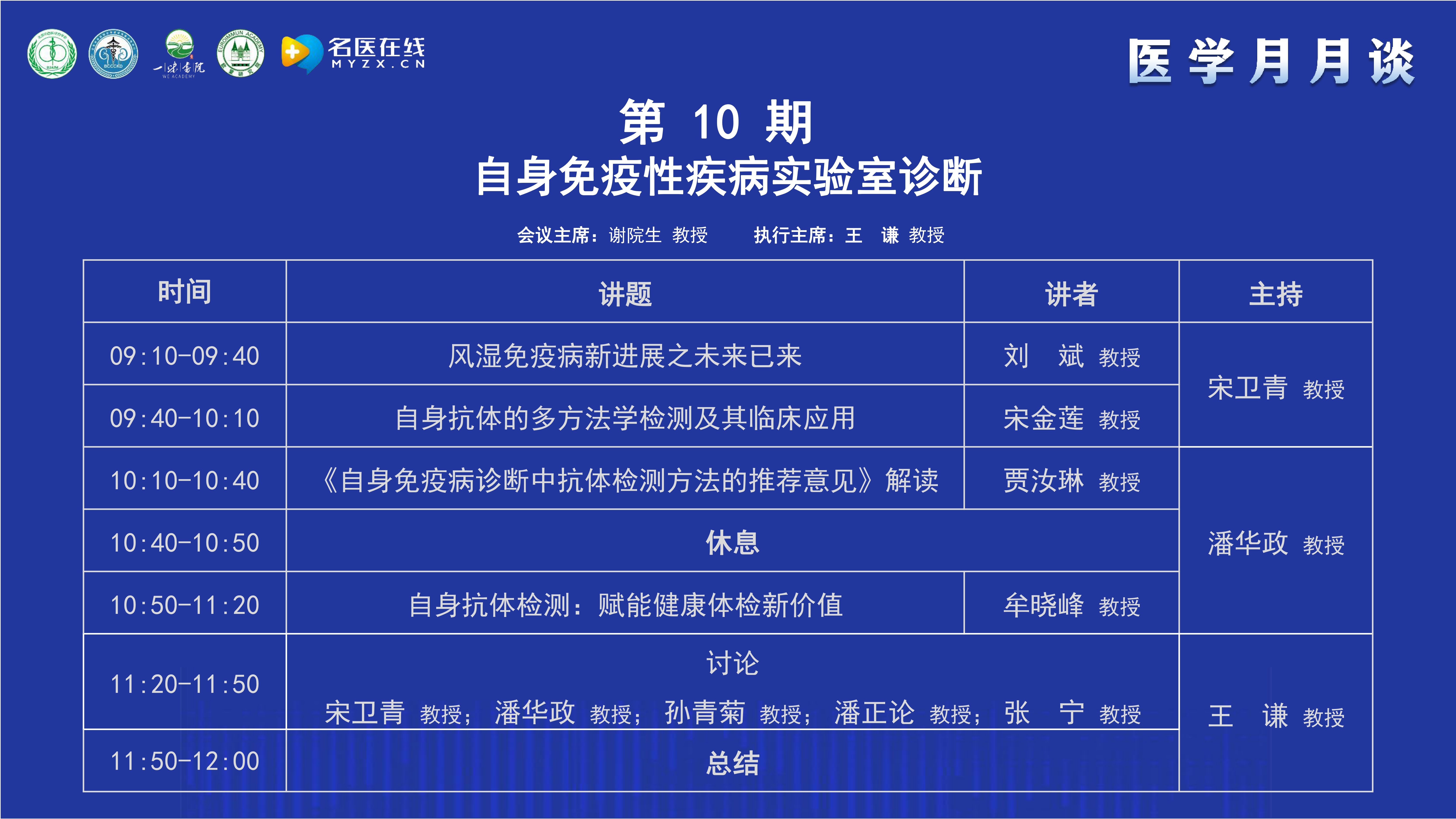 謝教授簡單介紹了“醫學月月談”的前身“腎病月月壇”的歷史,“腎病月月壇”是在疫情防控期間開展的線上學術交流活動,以腎臟病或系統性疾病腎損害的診治為主,每期一個主題,形式和內容都很受歡迎。為了讓更多的人受益,升級為“醫學月月談”。“醫學月月談”秉承“腎病月月壇”的優良傳統,聚焦醫學工作的熱點和難點,以臨床需求為導向,以解決臨床問題為目的,每月主辦1-2次線下和線上相結合的醫學交流活動,線下在全國的城市輪流舉辦,已相繼在北京、沈陽、上海、南京、武漢、福州、新疆等地成功舉辦9期醫學月月談。本期醫學月月談的主題是自身免疫性疾病實驗室診斷,非常榮幸的邀請到山東大學齊魯醫院王謙教授作為本期的執行主席,相信本期月月談將在王教授的引導下,在各位專家們的大力支持下,取得圓滿成功。